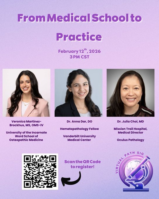 Description: PathSIG invites you to join our event, From Medical School to Practice. It will include a panel of speakers: a fourth-year medical student applying to pathology, a pathology fellow, and a practicing attending. We will cover common topics encountered as one progresses from student to attending.